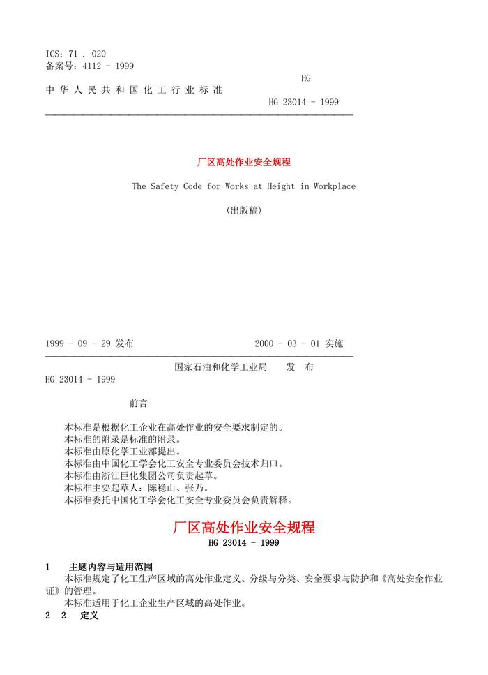 廠區(qū)高處作業(yè)安全規(guī)程HG23014-1999doc