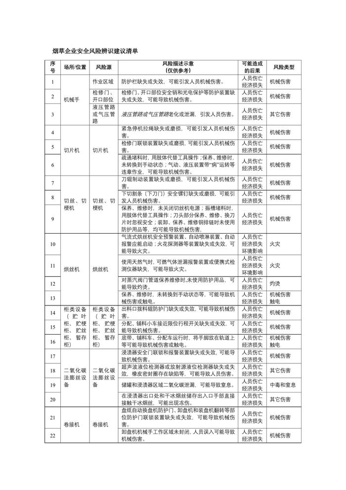 煙草企業(yè)安全風險辨識分級管控建議清單docx