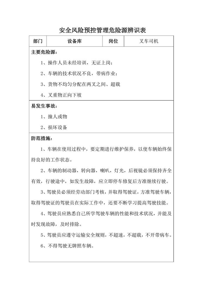 叉車(chē)安全風(fēng)險(xiǎn)預(yù)控管理危險(xiǎn)源辨識(shí)評(píng)價(jià)表doc