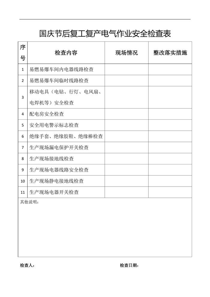 2021國(guó)慶復(fù)工“三個(gè)一”方案及檢查表doc