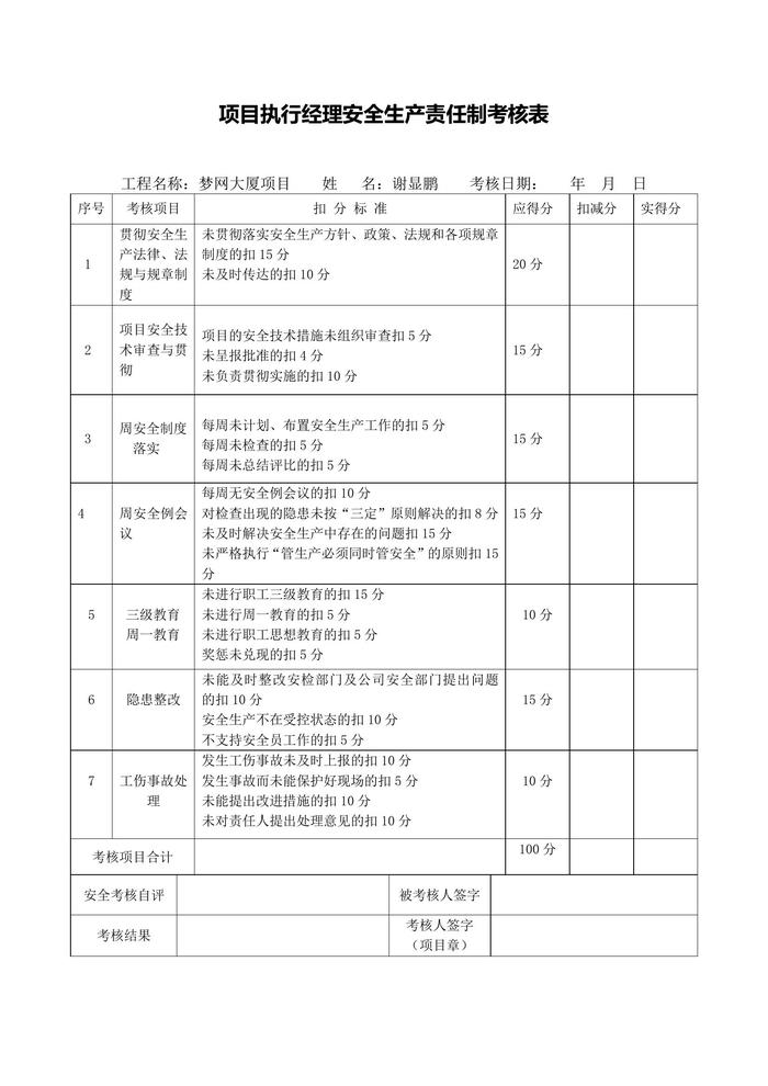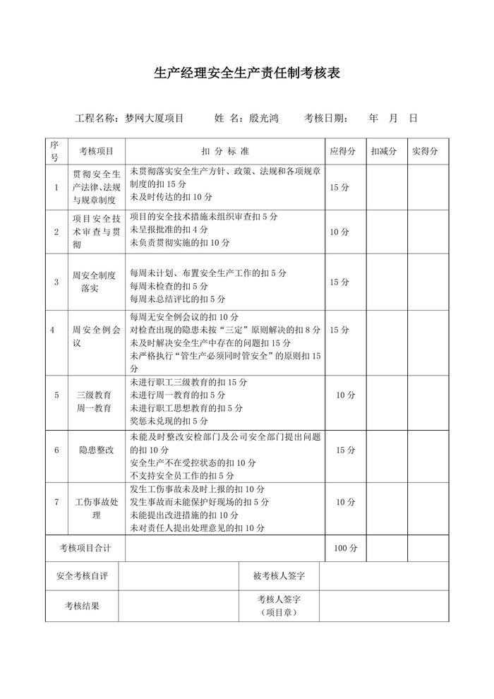 員安全生產(chǎn)責(zé)任制考核記錄表doc