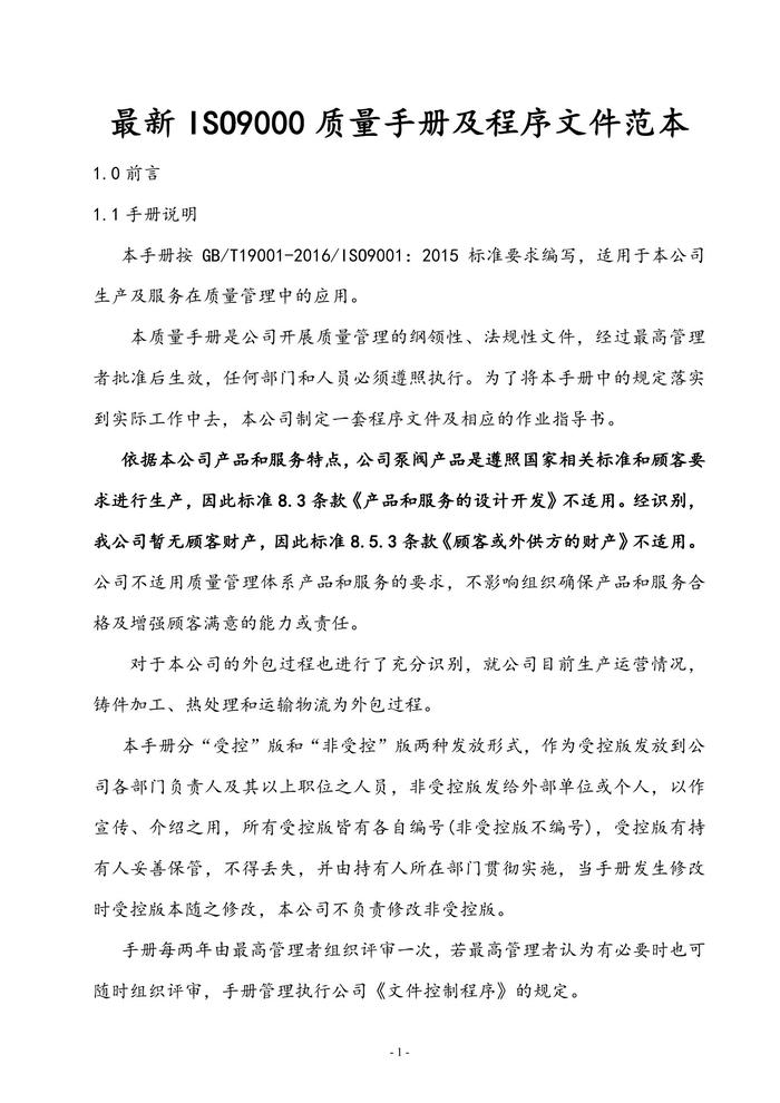 最新ISO9000質(zhì)量手冊及程序文件范本docx