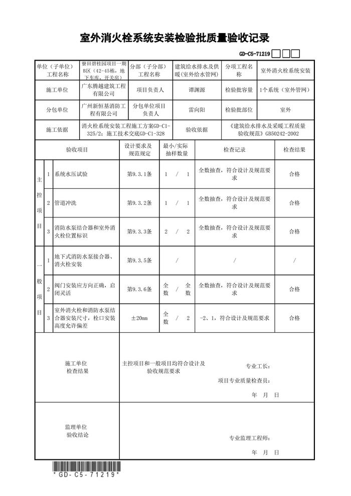 室外消火栓系統(tǒng)安裝檢驗批質(zhì)量驗xls