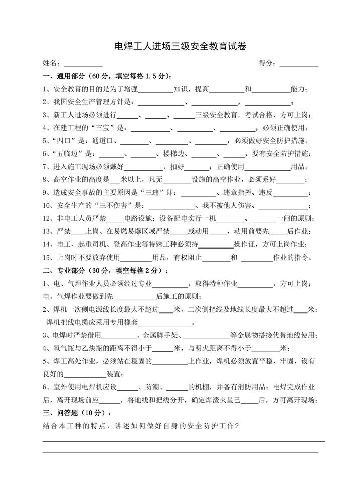新員工三級安全教育考試試卷及答案doc