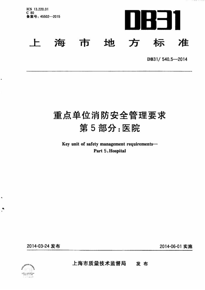 DB31_T 5405-2014 重點(diǎn)單位消防安全管理要求 第5部分_醫(yī)院pdf