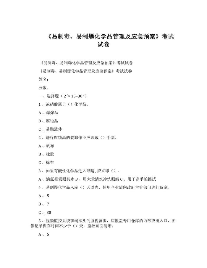 易制毒、易制爆化學(xué)品管理考試試卷docx 易制毒、易制爆化學(xué)品管理考試試卷docx