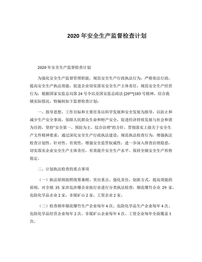 2020年安全生產(chǎn)監(jiān)督檢查計(jì)劃docx