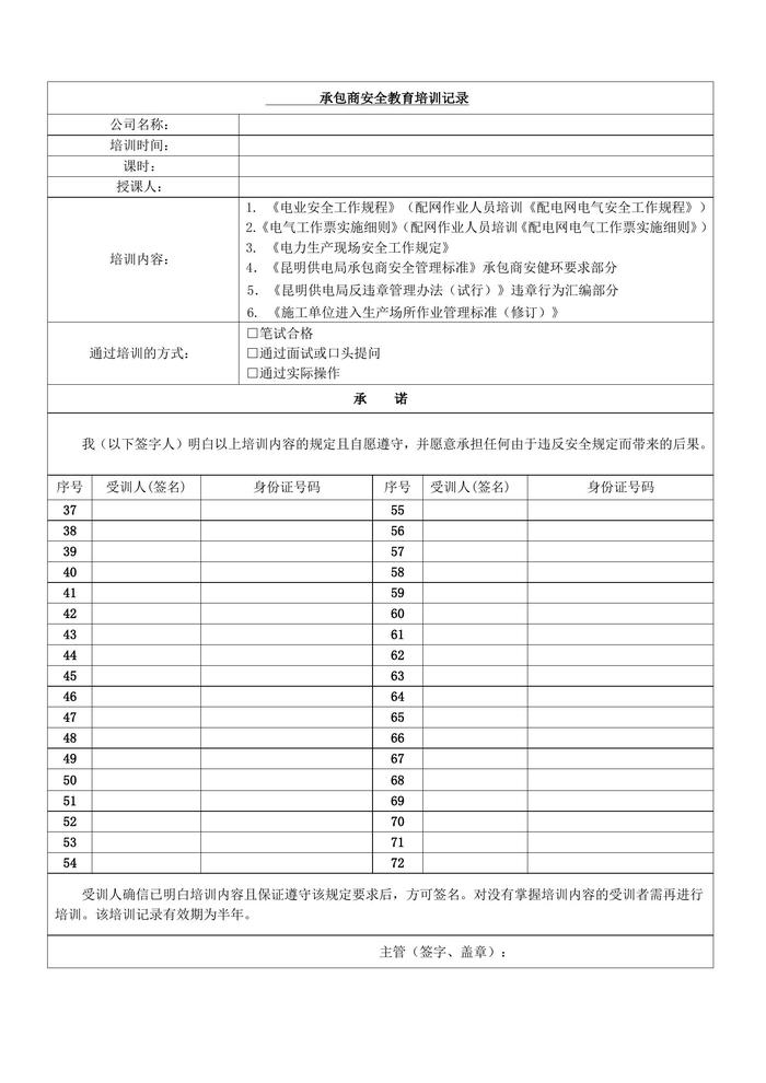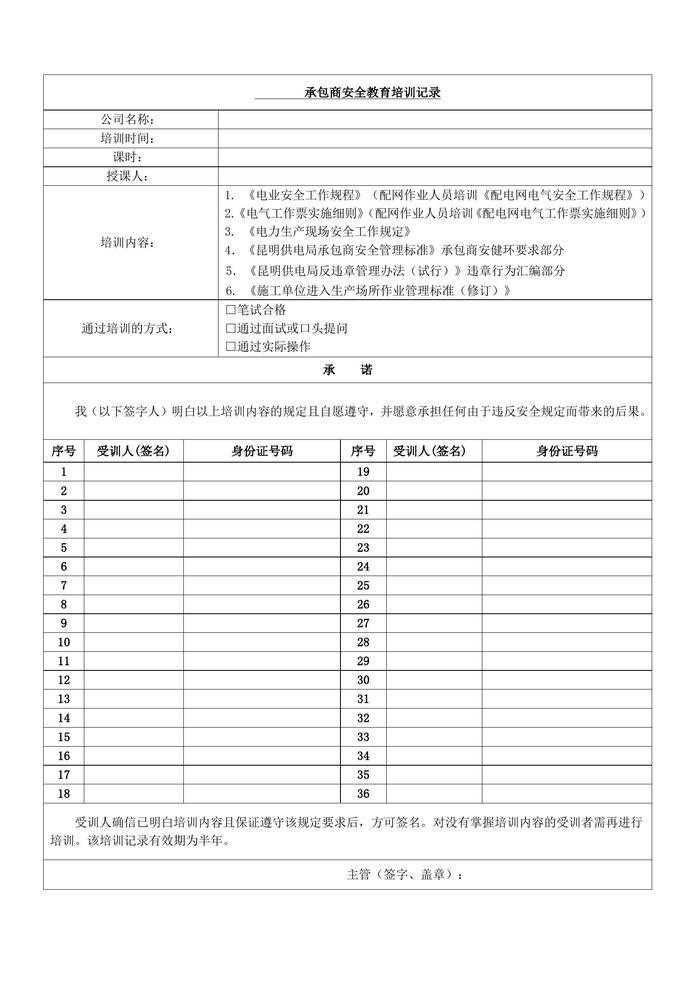 承包商安全培訓(xùn)記錄表(樣表)(1)doc