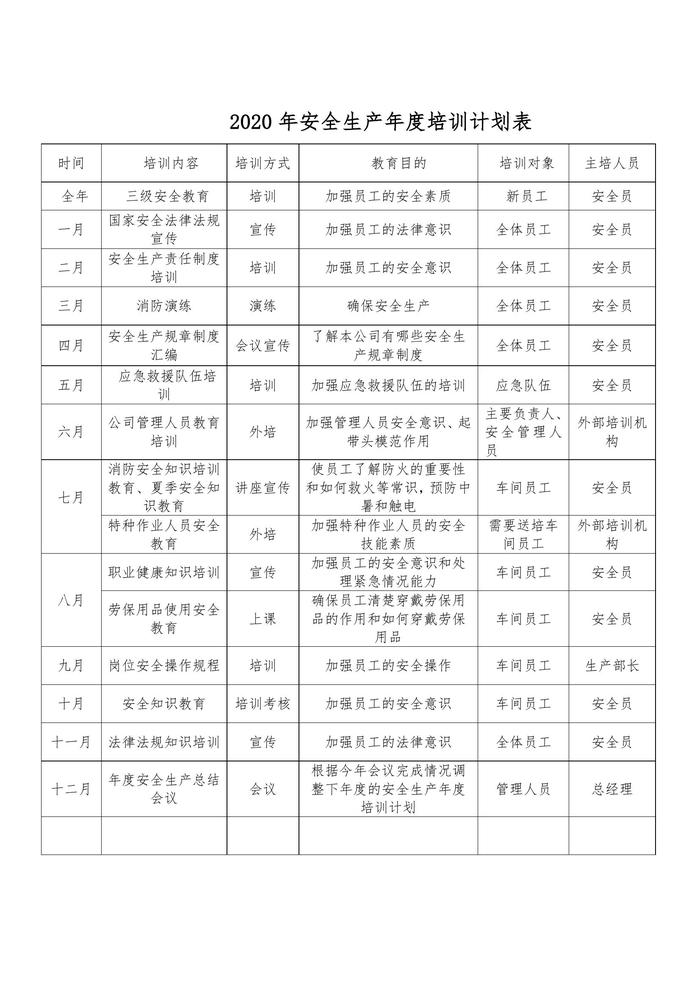 年度公司安全生產(chǎn)培訓(xùn)計(jì)劃表(1)doc
