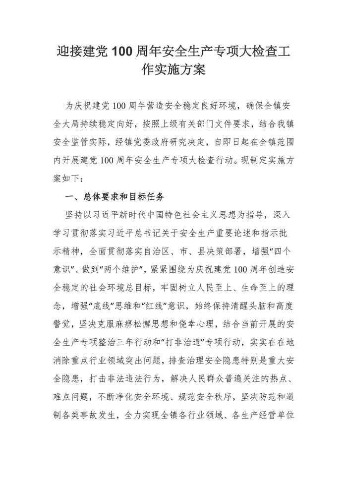迎接建黨100周年安全生產專項大檢查工作方案docx