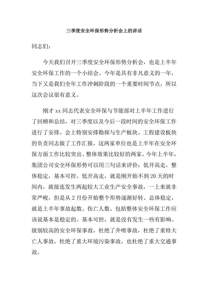 三季度安全環(huán)保形勢分析會上的講話(1)doc