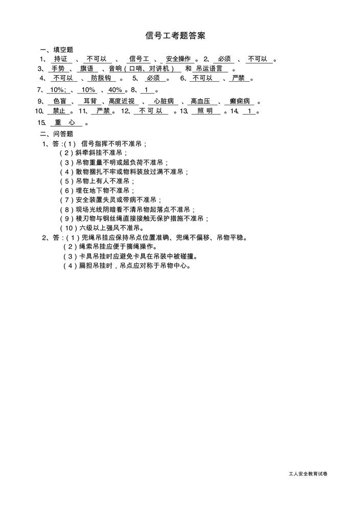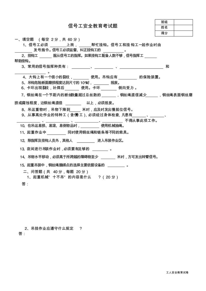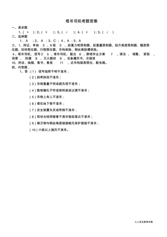 分工種安全教育考試試卷pdf