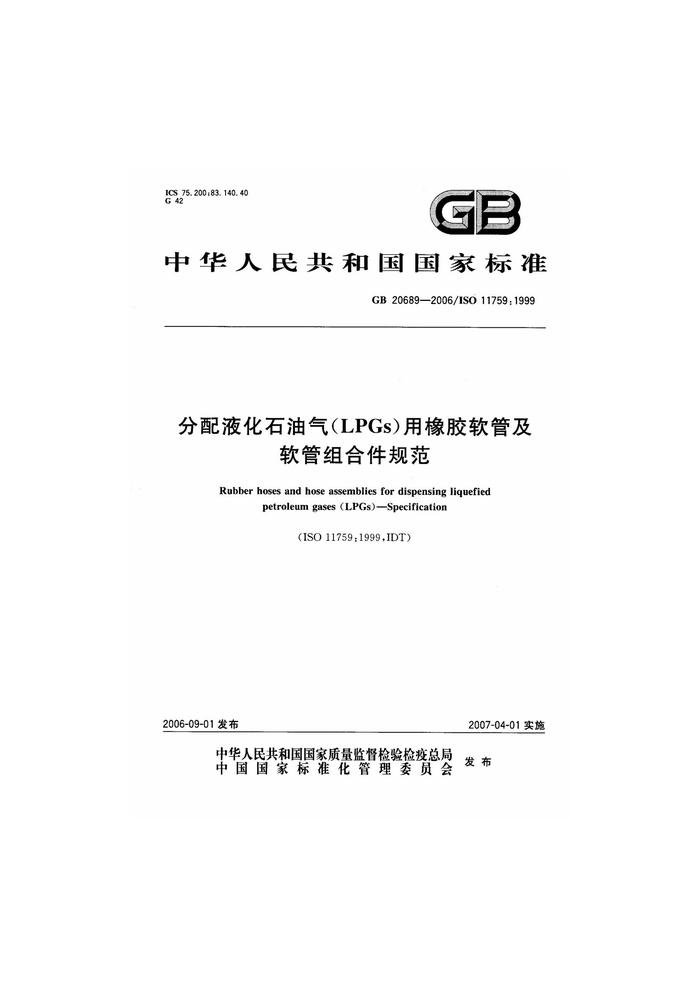 GB 20689-2006 分配液化石油氣(LPGs)用橡膠軟管及軟管組合件規(guī)范pdf