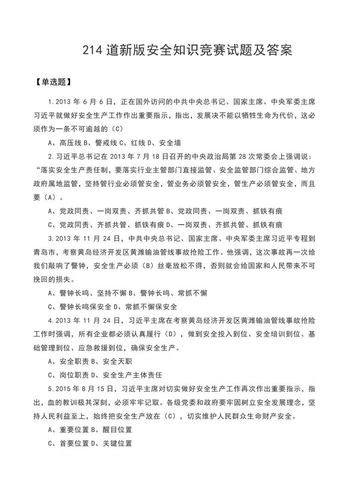 214道新版安全知識(shí)競(jìng)賽試題及答案docx