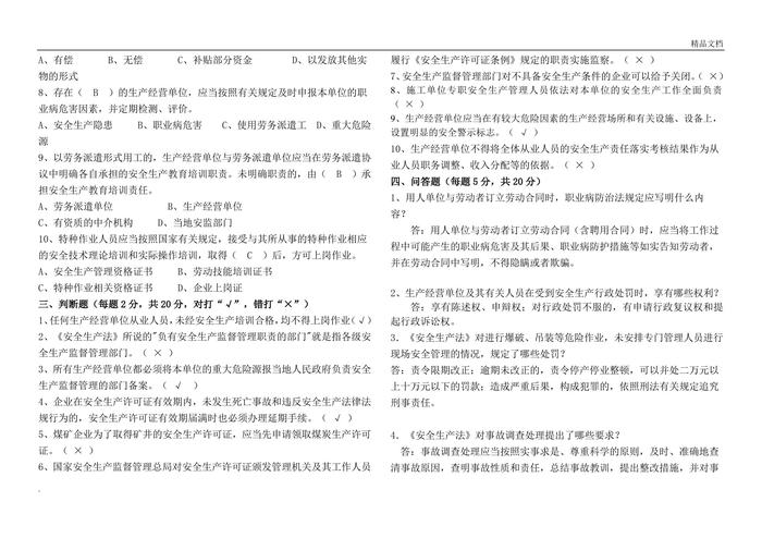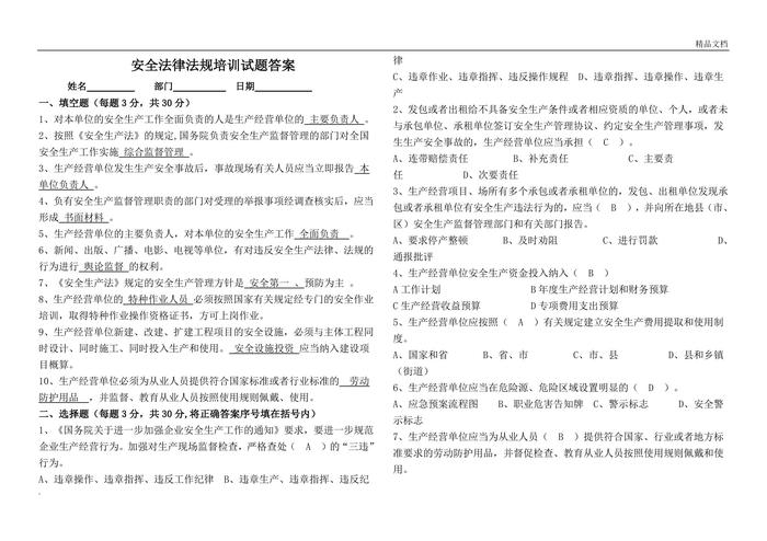 安全法律法規(guī)培訓(xùn)試題及答案doc