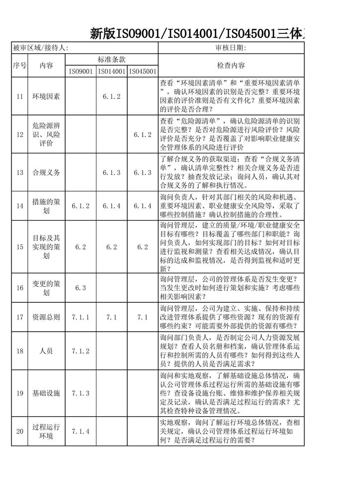 新版ISO9001-ISO14001-ISO45001三體系內(nèi)部審核檢查表xls