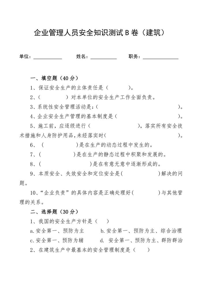 管理人員安全生產(chǎn)知識(shí)測(cè)試試卷Bdoc