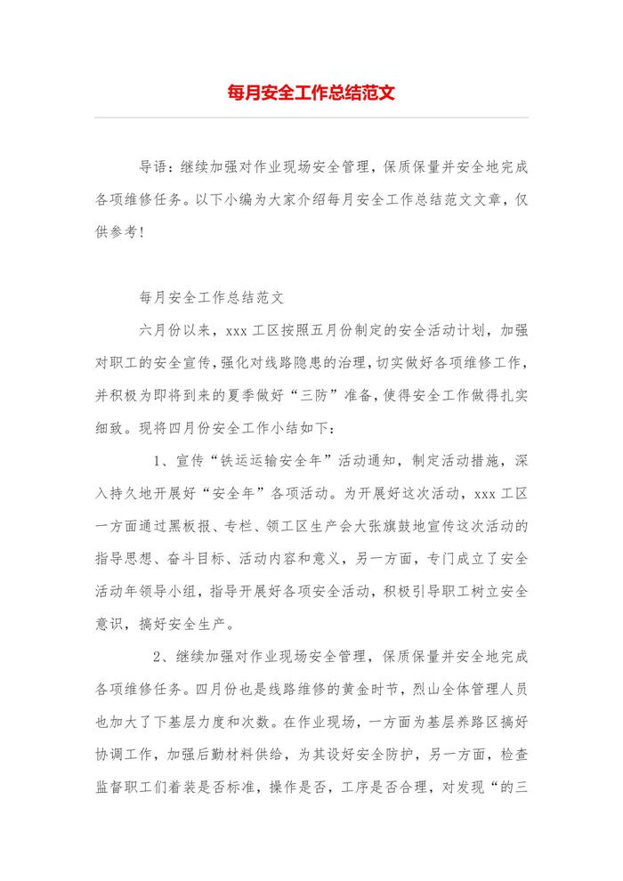 每月安全工作總結(jié)范文doc