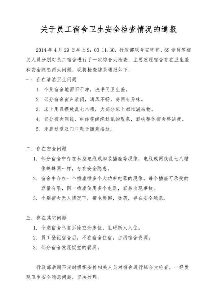 員工宿舍檢查情況通報(bào)(1)doc