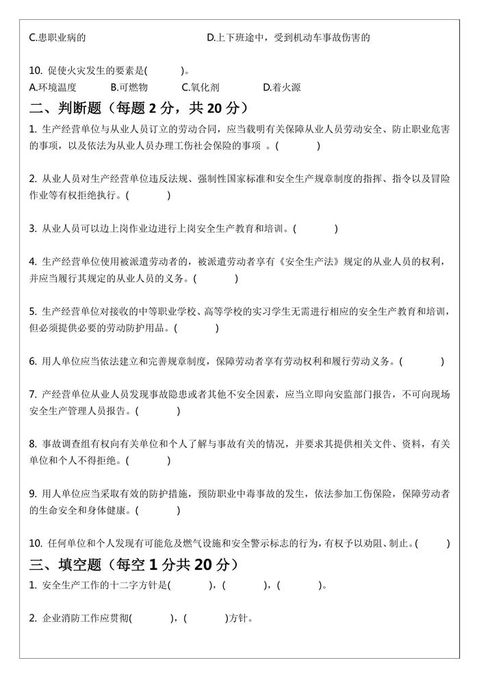 三級安全教育試題(公司級、部門級、班組級)docx 三級安全教育試題(公司級、部門級、班組級)docx