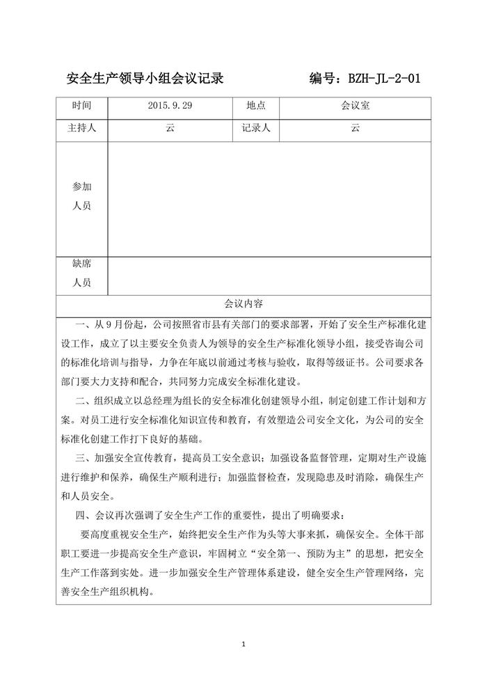 安全生產(chǎn)領(lǐng)導(dǎo)小組會(huì)議記錄、紀(jì)要、落實(shí)情況反饋表 編號(hào)docx