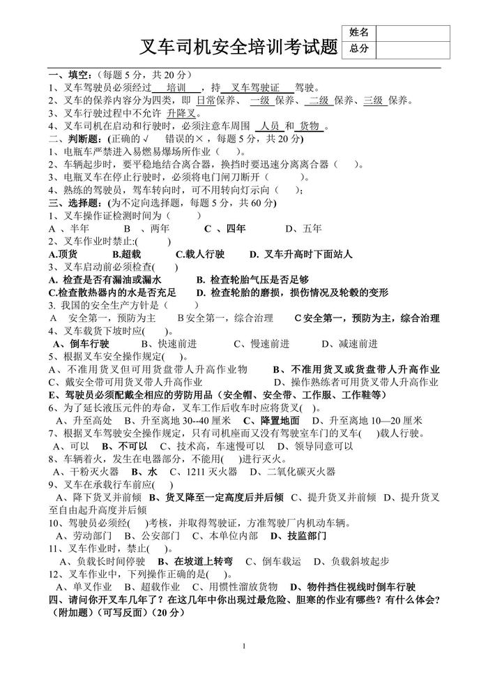 叉車(chē)司機(jī)考試題doc