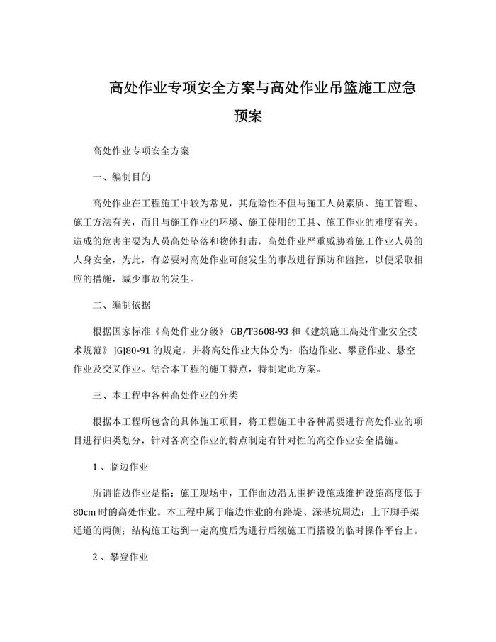 高處作業(yè)專項安全方案與高處作業(yè)吊籃施工應急預案docx