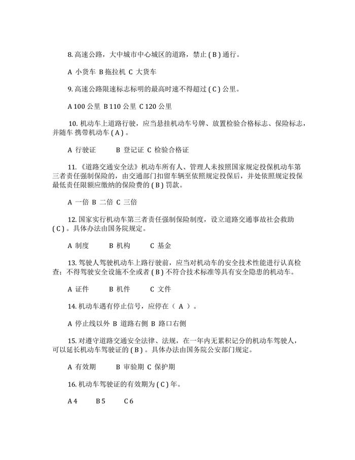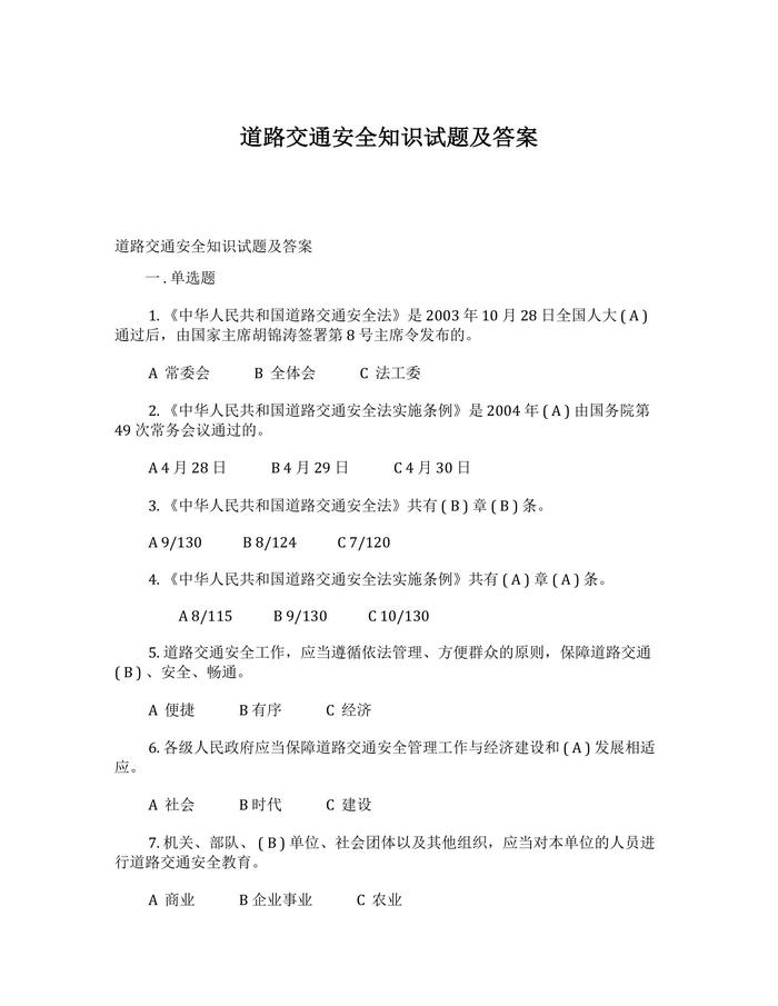 道路交通安全知識試題及答案docx