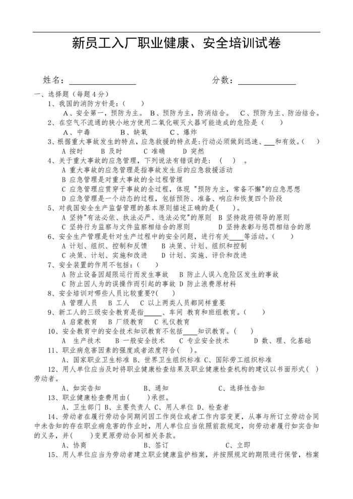 新員工入廠安全培訓(xùn)試卷及答案doc