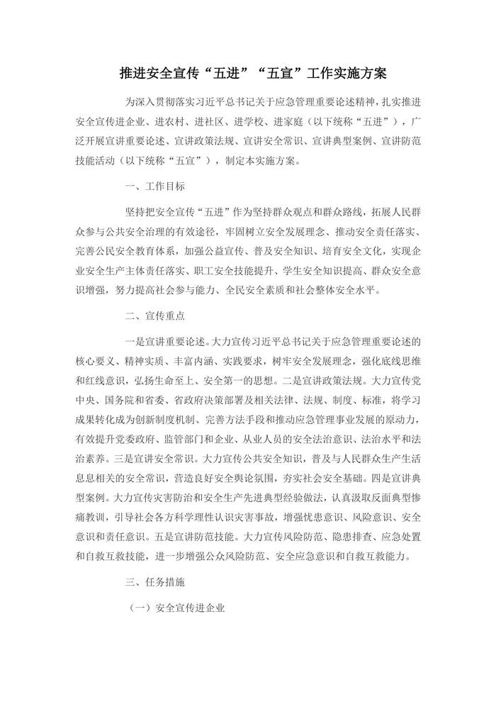 推進安全宣傳“五進”“五宣”工作實施方案(1)doc