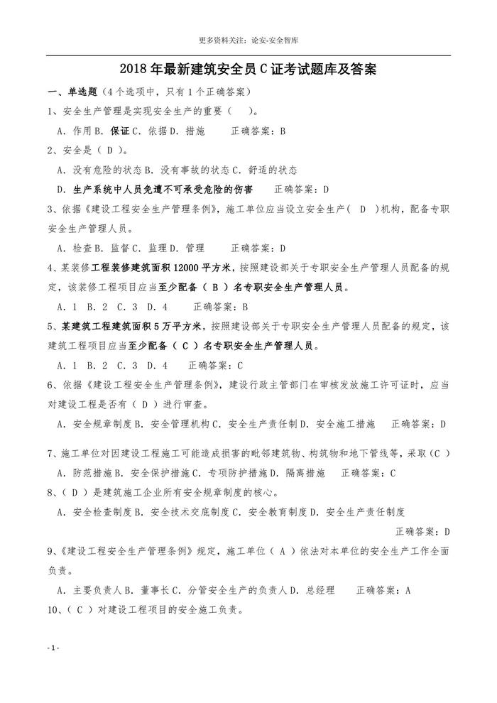 2019年最新安全員C證考試題庫及答案(最全)(1)doc