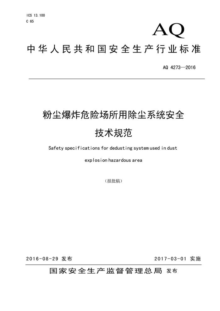 AQ 4273-2016 粉塵爆炸危險(xiǎn)場(chǎng)所用除塵系統(tǒng)安全技術(shù)規(guī)范pdf