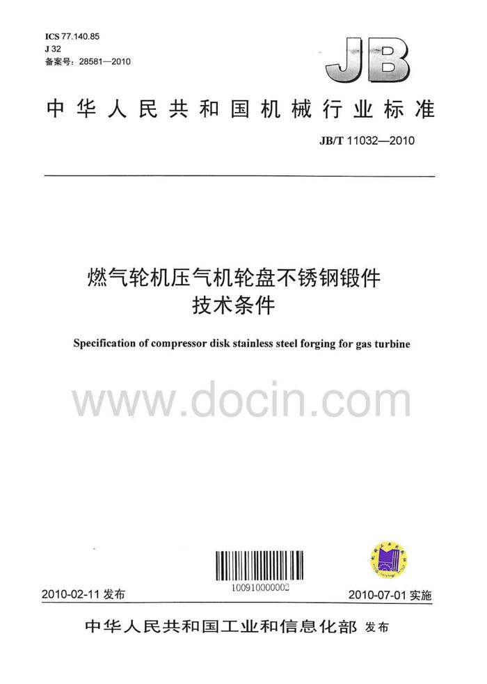 JB 11032-2010-T 燃氣輪機壓氣機輪盤不銹鋼鍛件 pdf