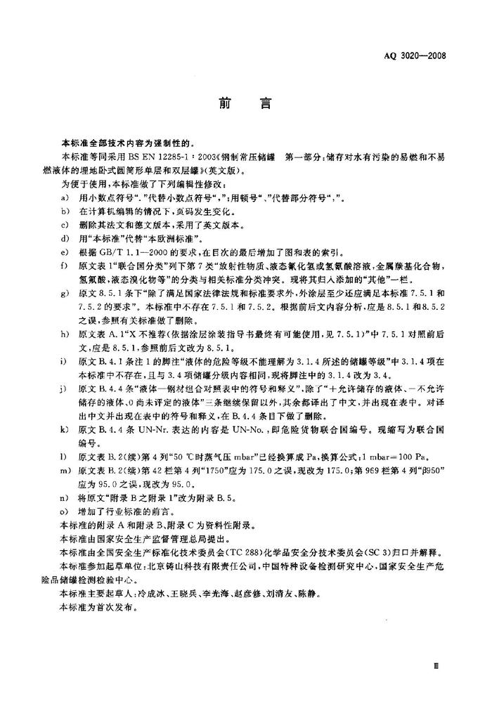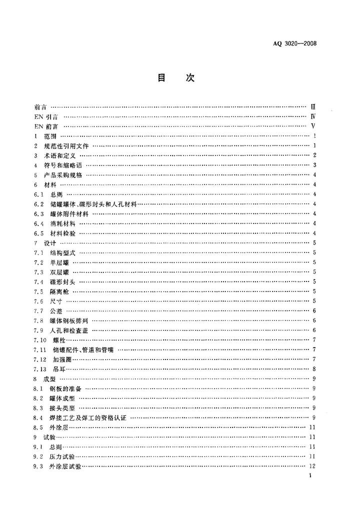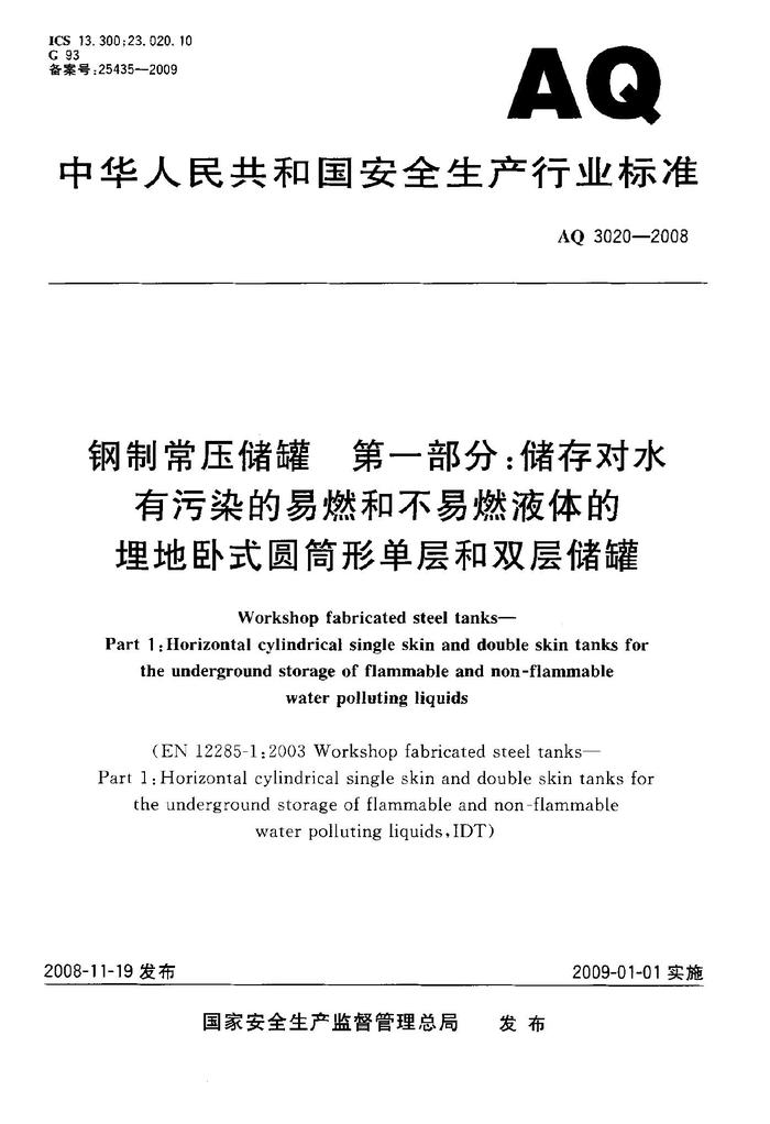 AQ 3020-2008; 鋼制常壓儲罐 第一部分:儲存對水有污染的易燃和不易燃液體的埋地臥式圓形單層和雙層儲存罐pdf