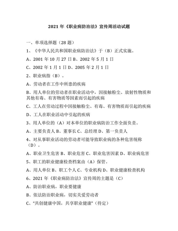 2021年《職業(yè)病防治法》宣傳周活動(dòng)試題docx