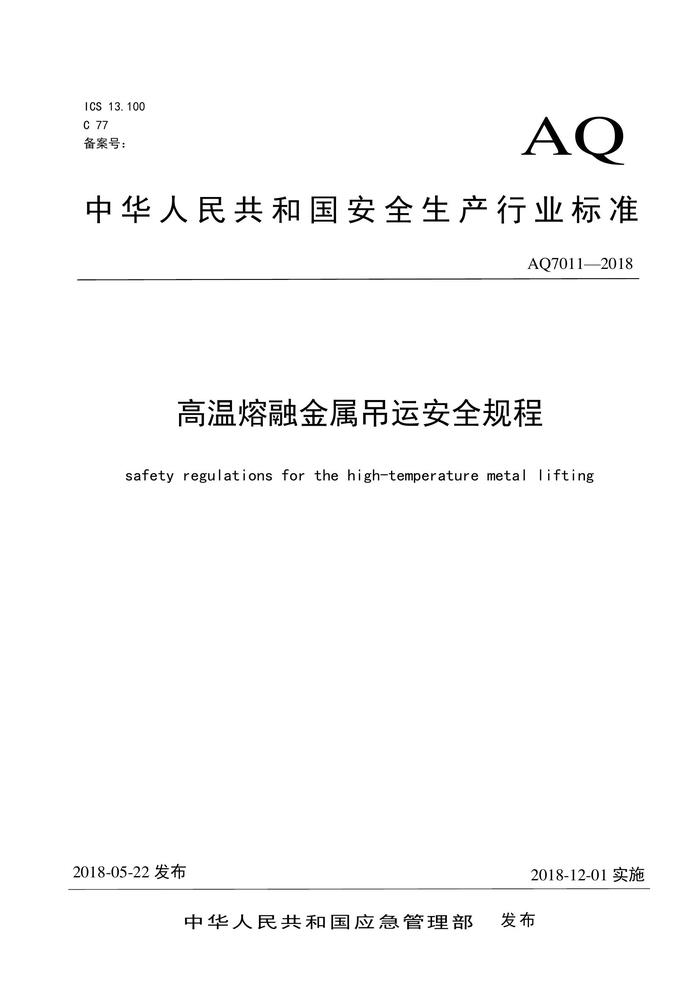AQ7011-2018《高溫熔融金屬吊運(yùn)安全規(guī)程》pdf