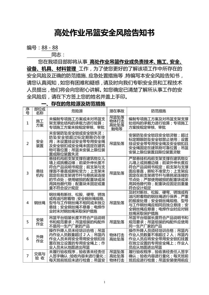 高處作業(yè)吊籃安全風險告知書(1)doc