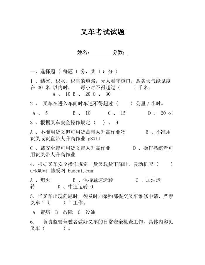 叉車考試試題含答案(8頁)docx