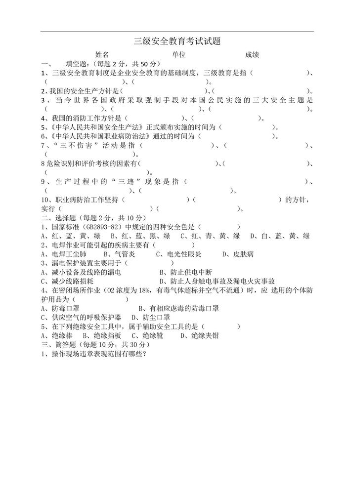 三級(jí)安全考試_車間級(jí)doc