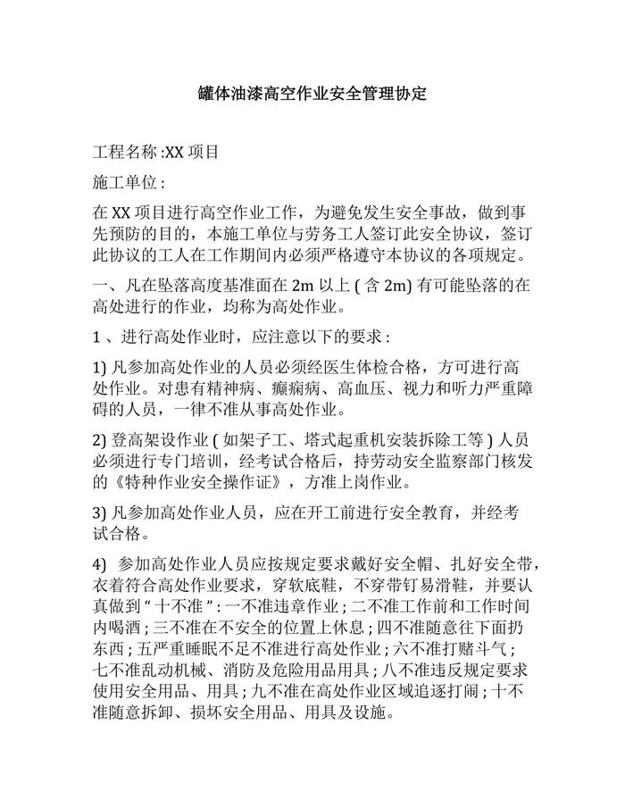 罐體油漆高空作業(yè)安全管理協(xié)定(1)docx