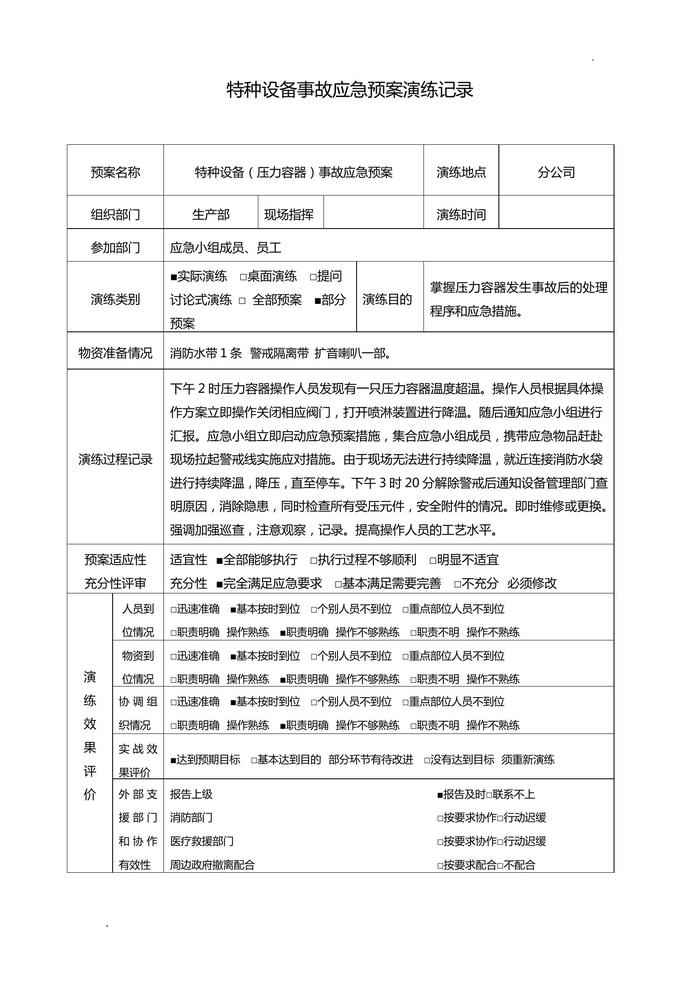 特種設(shè)備事故(壓力容器)應(yīng)急預(yù)案演練記錄(1)(1)doc