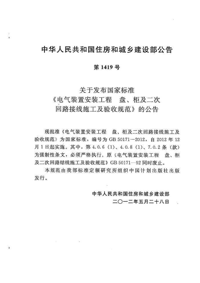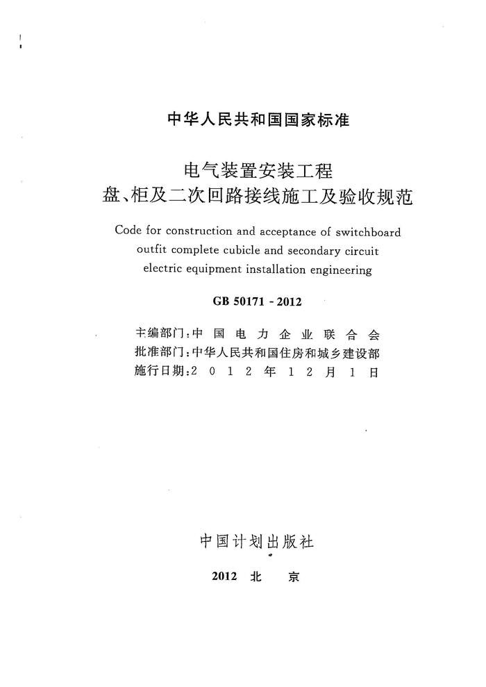 GB50171-2012 電氣裝置安裝工程 盤、柜及二次回路接線施工及驗(yàn)收規(guī)范pdf GB50171-2012 電氣裝置安裝工程 盤、柜及二次回路接線施工及驗(yàn)收規(guī)范pdf