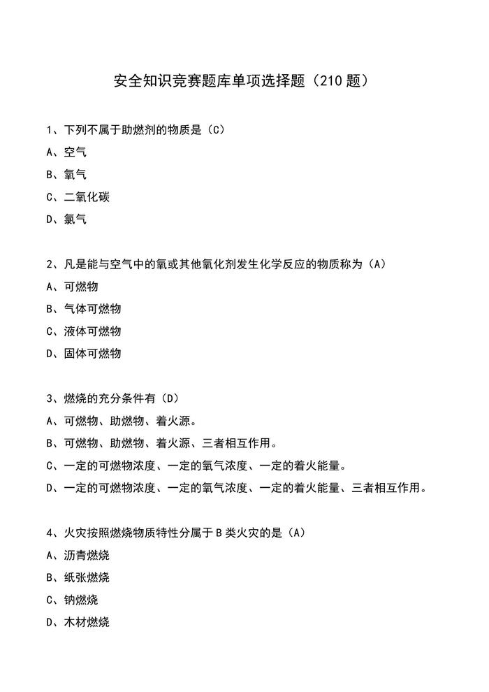 安全知識(shí)競(jìng)賽題庫單項(xiàng)選擇題(210題)docx