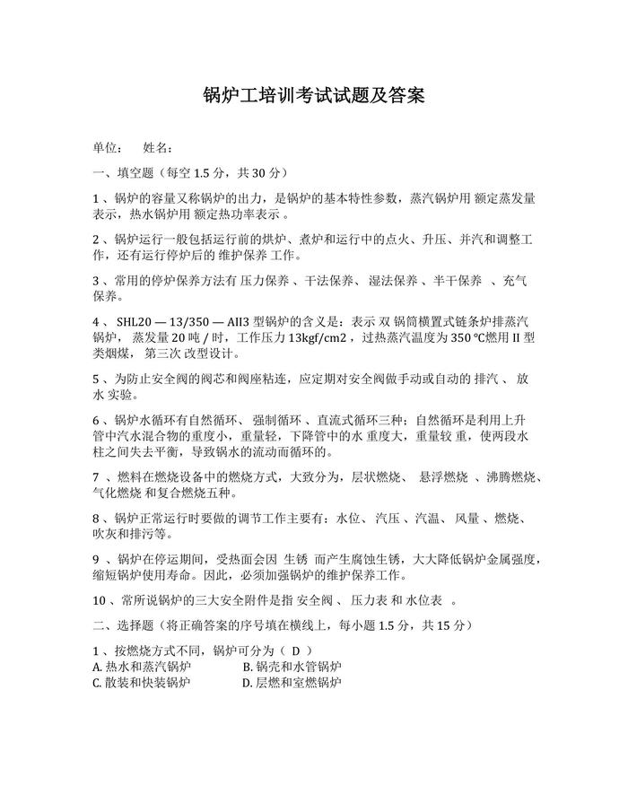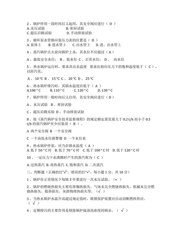 鍋爐工培訓考試試題及答案docx