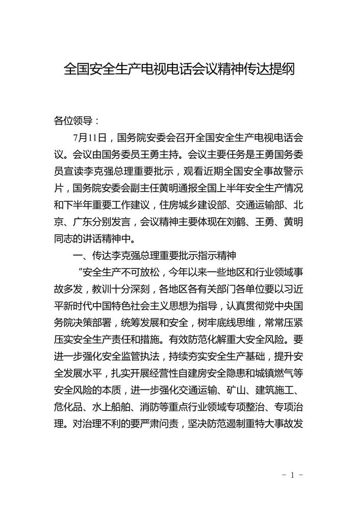 711全國(guó)安全生產(chǎn)電視電話會(huì)議精神傳達(dá)提綱doc