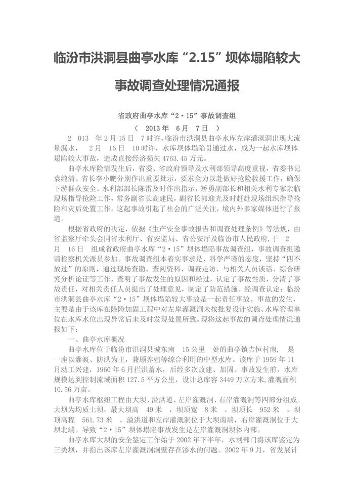 臨汾市洪洞縣曲亭水庫“215”壩體塌陷較大事故調(diào)查處理情況通報doc
