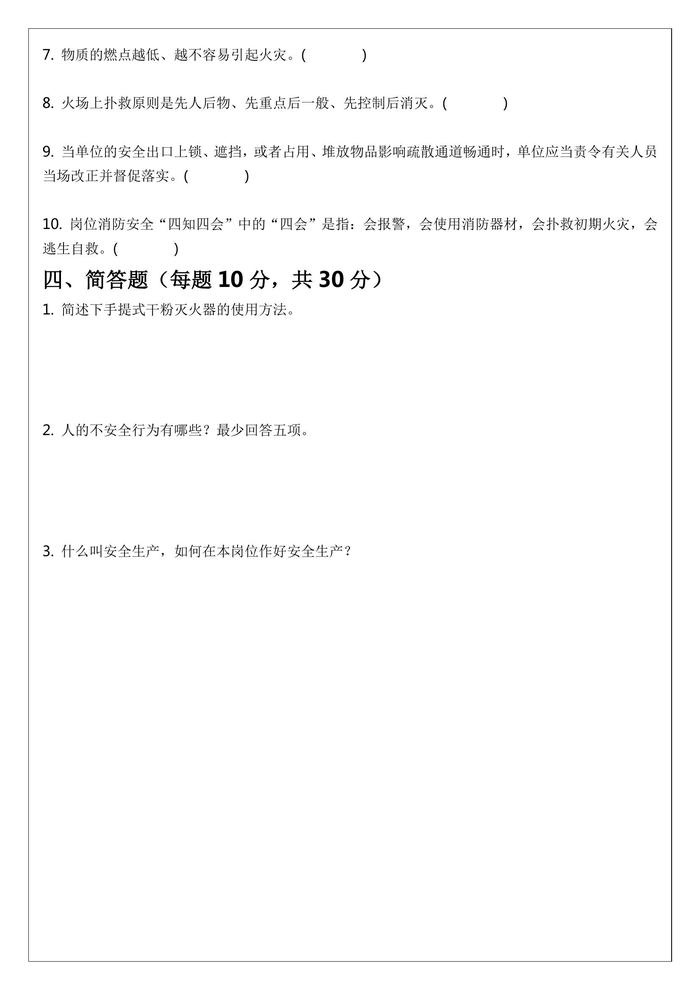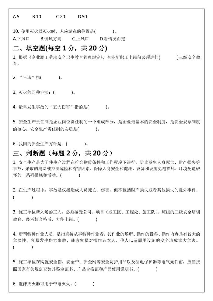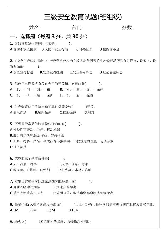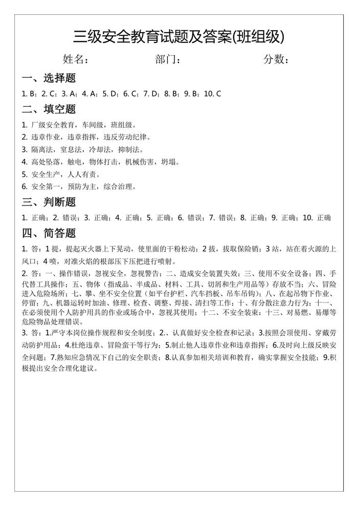 三級安全教育試題及答案(班組級)docx