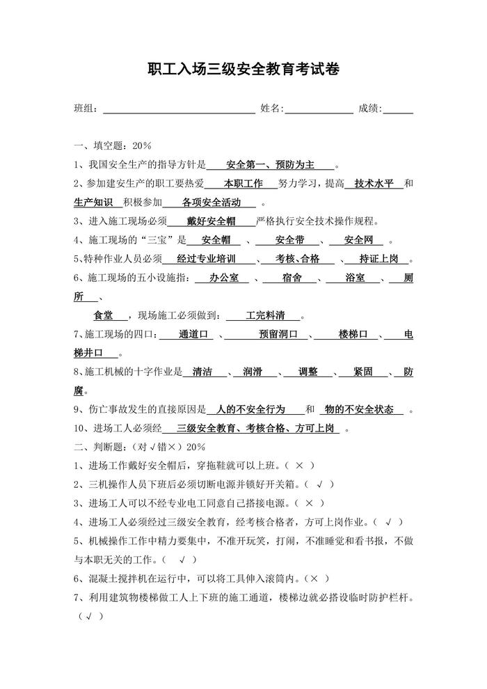 職工入場(chǎng)三級(jí)安全教育考試卷docx