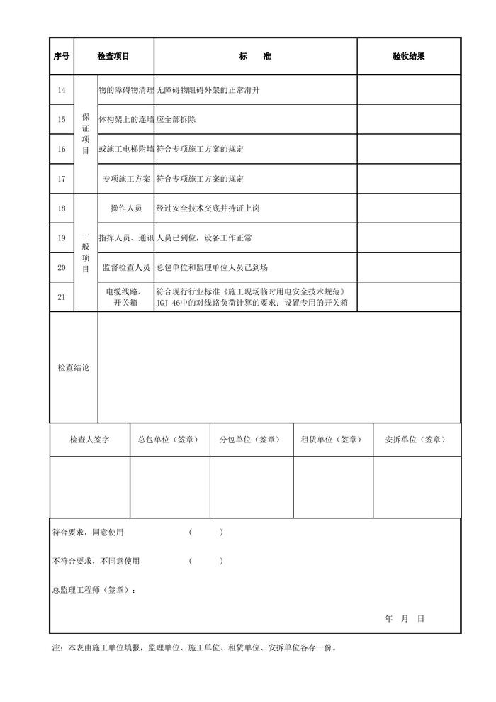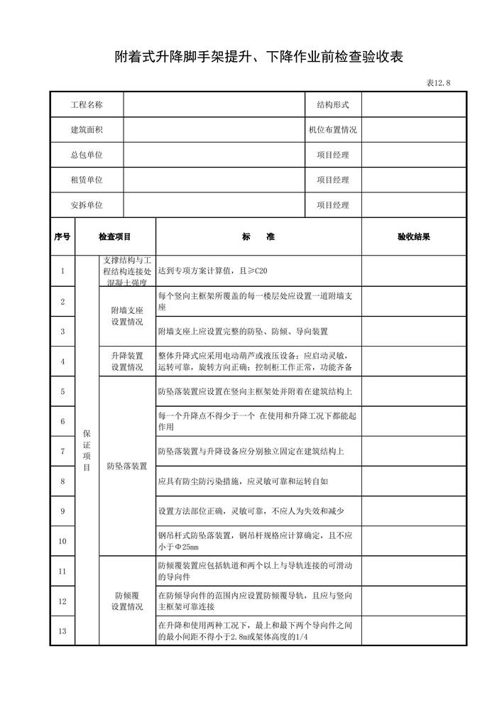 附著式升降腳手架提升、下降作業(yè)前檢查驗(yàn)收表xls 附著式升降腳手架提升、下降作業(yè)前檢查驗(yàn)收表xls
