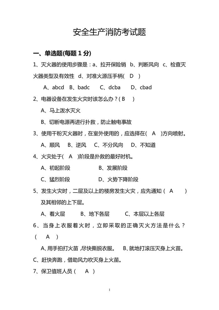 省安監(jiān)局消防考試試卷及答案(A)docx